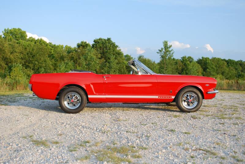 65 Mustang décapotable avec V8 289, carbu 4 corps, Boite vitesse 5 manuel, direction assistée, frein avant à disque, capote automatique, 84 470 Miles soit 135 000 Km, double echappement.